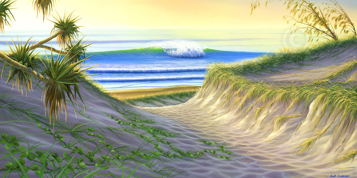 Simply created from sketches and memories of Moreton Island, this painting captures the morning sun lighting up a clean wave through a beach track. The highest quality archival materials have been used on this signed and numbered limited canvas edition of 300.